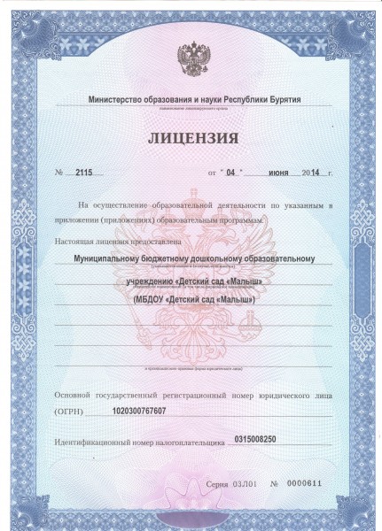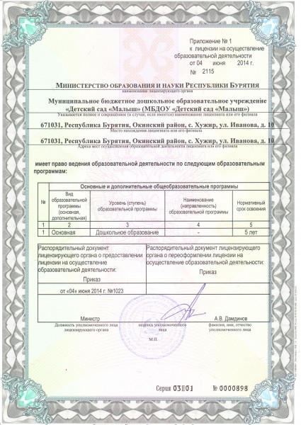 МБДОУ «Детский сад «Малыш» По решению Исполкома Окинского аймсовета от 05.12.1977г. № 148 и Акт