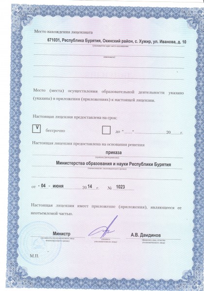 | Адрес местонахождения образовательной организации* | 671032, Республика Бурятия, Окинский район, с. Хужир, ул. Иванова, д.10 |